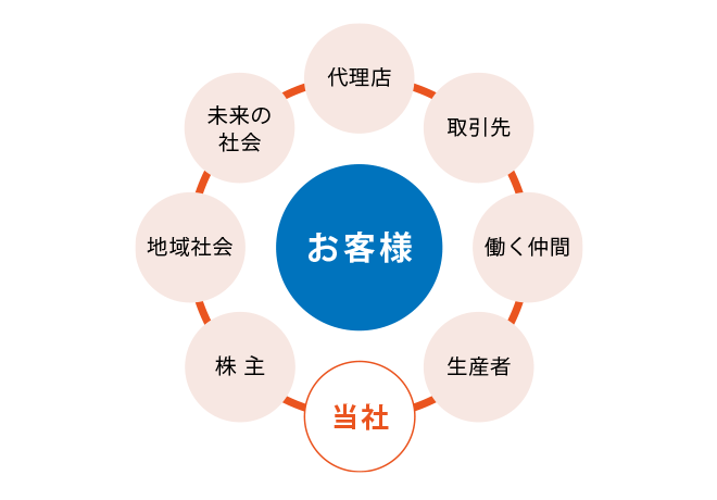 - 閉塞する現代社会において、多くの人や企業が「自分さえ良ければ」という価値観に支配されています。私たちはそうした価値観とは一線を引き、お客様・代理店・取引先・働く仲間・生産者・株主・地域社会・そして未来の社会、すべてがハッピーになる持続可能な事業のあり方を追求し続けていきたいと考えています。